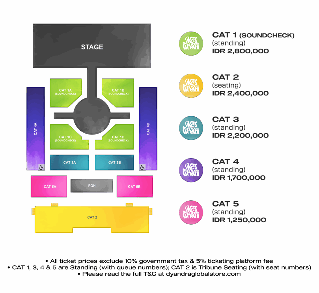 • Ticket holders for CAT 1 A-B-C-D (Soundcheck), CAT 3 A-B, CAT 4 A-B and CAT 5 A-B will receive a queue number, while CAT 2 ticket holders will receive a seat number.